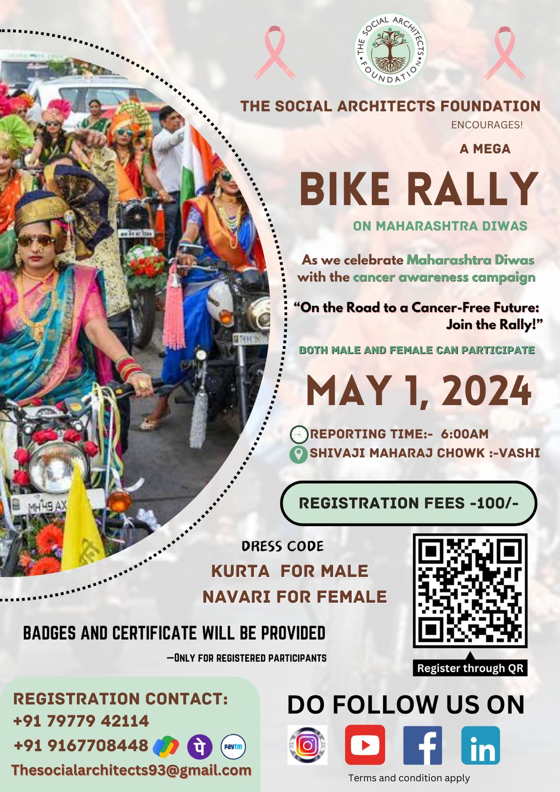 “📢 Attention Participants! Join us for our Bike Rally on Cancer Awareness in Vashi, Navi mumbai on May 1st, 2024! By participating, you’ll: